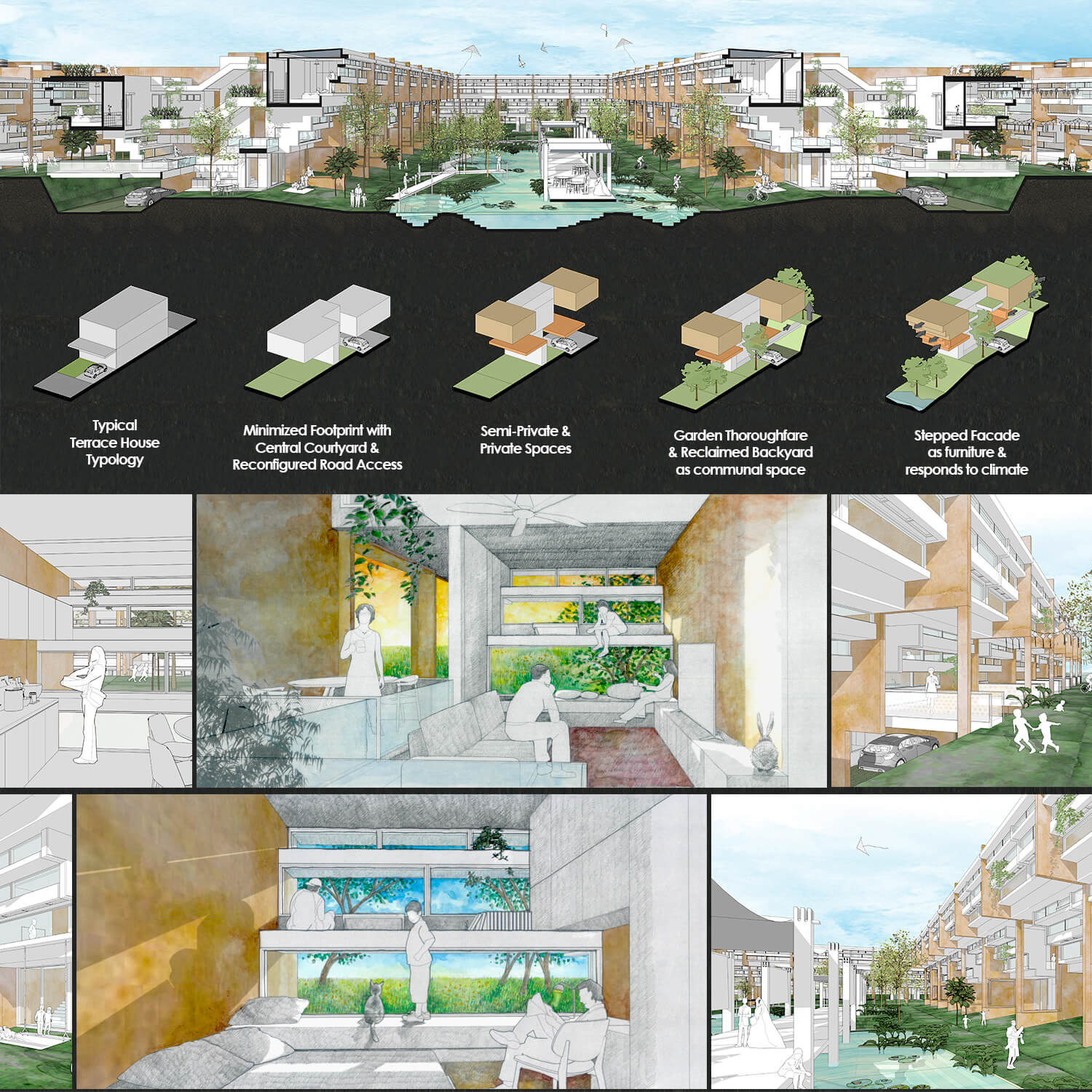 Exploring the possibility of allowing landscape to permeate the house, a garden thoroughfare is created literally through the house. This creates an unobstructed view of greenery from the front to the back, which affords not only great ventilation, but also opens up the permeability of the ground. The freed-up ground plane invites a space that merges interior and landscape, setting up a conducive sociable area. This space extends beyond the front to a central constructed wetland with open decks that is shared with the neighbourhood, whereby festivities, weddings, funerals could be held. The constructed wetland serves as an additional layer of natural stormwater detention, with bio-swales to filter dirt and mud, keeping the water of the wetland clear.