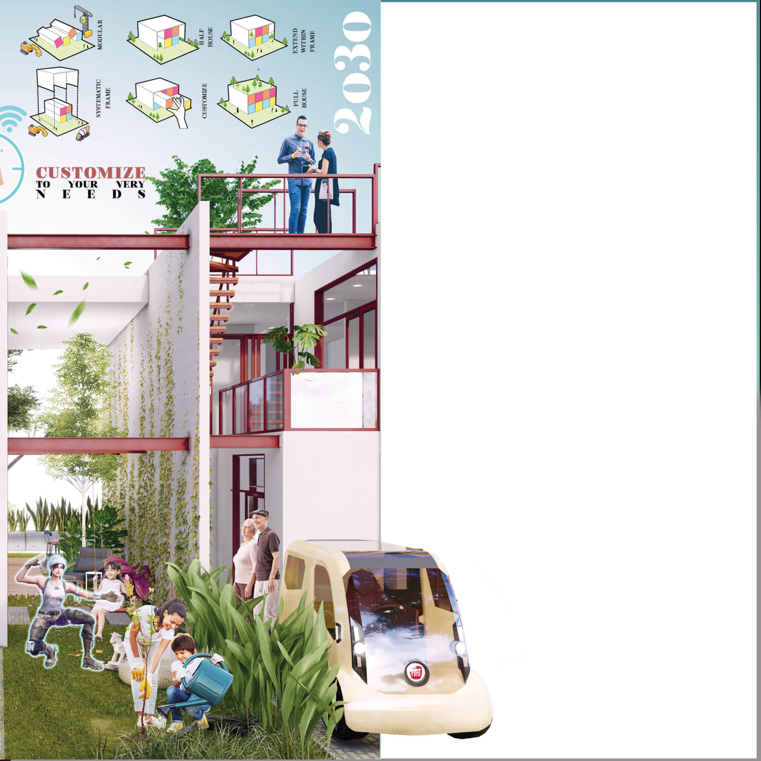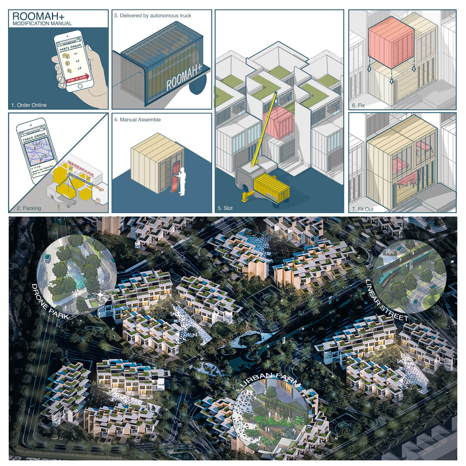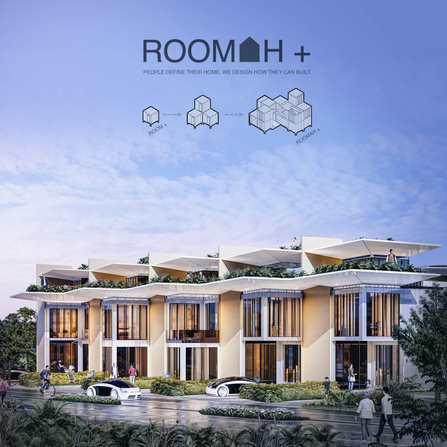 Room+ → Roomah+ ROOMAH+ is for everyone; from bachelor, couple, small family to big family of three generations under one roof. With the advantage of modular construction, ROOM+ can be plugged and played within the lot boundary. It can be placed beside, on top or to be slotted underneath each other with endless combinations. As a whole, one row of housing modules is designed to surround urban farms and amenities to arouse a stronger sense of belonging. We visualized linear streets that embrace the coexistence of autonomous vehicles, landscapes, pedestrians and pets. The neighborhoods will be weaved together by these pedestrian friendly linear streets that connect into highways with faster mobility at the perimeter of the master plan.