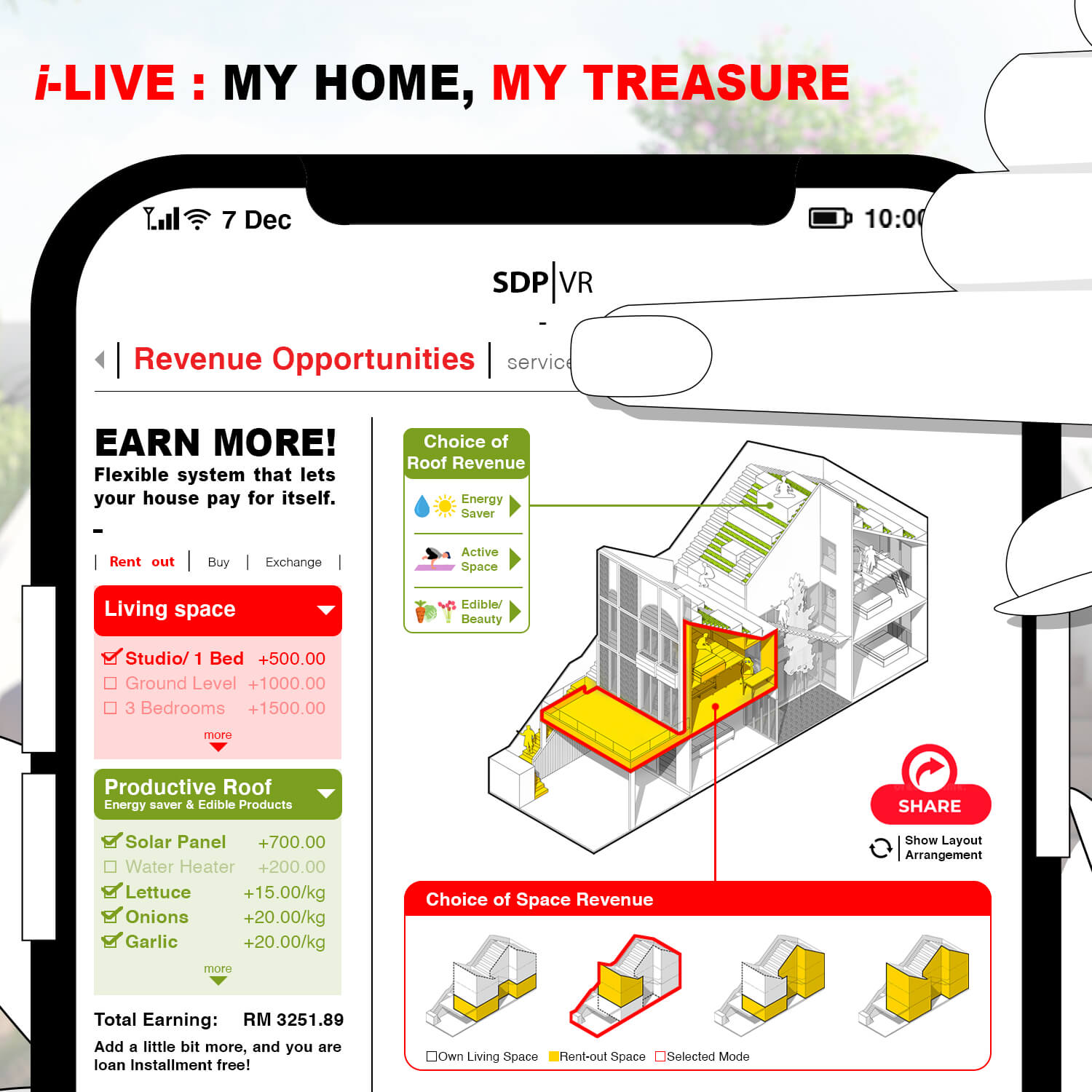 Affordable? It goes beyond building more cost-efficient homes. Imagine a house that starts to pay for itself and generate additional income for the owner as they live in it. As housing price increases over the year, they have become a liability more than the safety net that they always were, burdening purchasers with monthly installments for life where renting can be more affordable. i-LIVE looks to reverse this trend by having homes that fully uses all the space, volume, plane, surface that are currently under-utilized to generate revenue for the owner to assist in the monthly repayment of the home, making homes more affordable yet not reducing the value generation of property development.