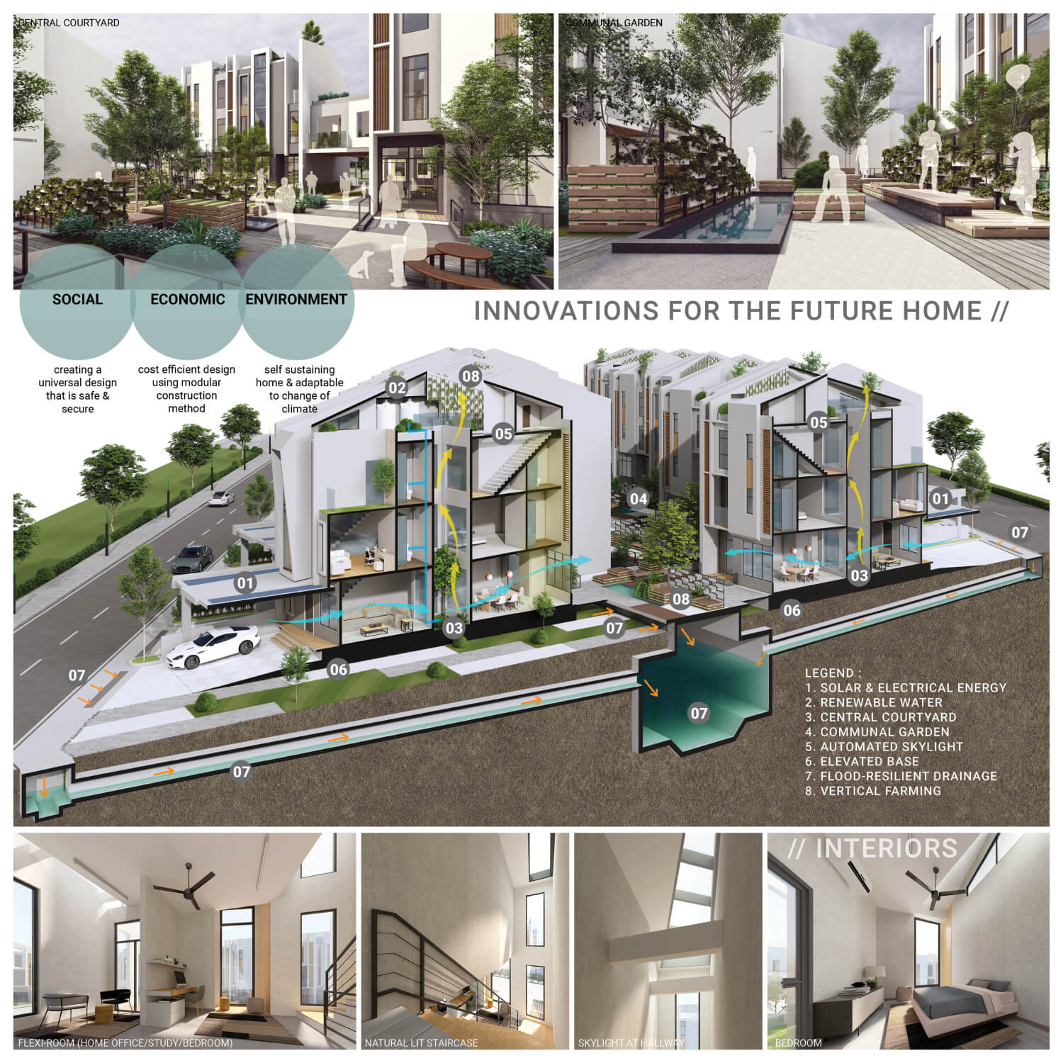 [noun. an act or instance of placing close together or side by side, especially for comparison or contrast. the state of being close together or side by side.] With the changing world climate, we envisioned that future homes to be a self-sustaining dwelling with adaptability to the environment while maintaining the aesthetic value of a home. Global warming and sea water rising are among the climate issues we are facing and should be considered in designing our future homes. The design of this future concept home merely a juxtaposition of flat site and angled floor plans with careful considerations of the environment in creating a sustainable living place. With the plot size of 20’ x 70’ and sets anywhere in Malaysia, we are building not just a terrace house, but a home with spaces that adaptable to climate change. Our design objectives focus on these 3 key design principles: